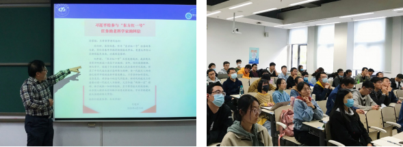 曹晋滨通过讲述中国人造卫星事业的倡导者和奠基人之一、“两弹一星”元勋赵九章先生的经历,向同学们生动展现了“热爱祖国、无私奉献,自力更生、艰苦奋斗,大力协同、勇于登攀”二十四个字的内涵。赵九章先生在幼时接触新文化书刊,激发强烈爱国热情,早年加入中国共产主义青年团,坚信只有中国共产党才能救中国,解放前夕与国民党政府斗智斗勇,拒绝迁往台湾,将宝贵的气象资料和科研器材保存下来,迎接新中国成立。