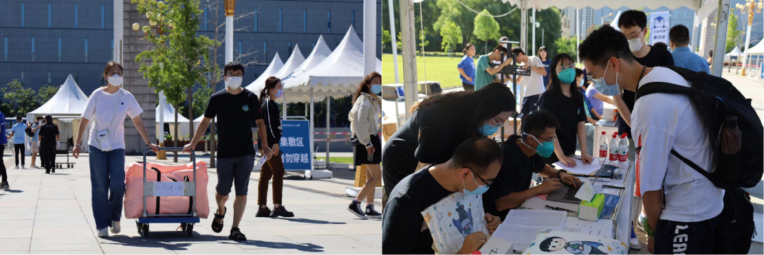 伴随着第一位新生踏入校园,迎新工作正式开始。学生们通过人脸识别、体温检测、出示“校园通行卡”绿码、出示录取通知书等环节后,有序进入校园。在志愿者的引导下完成注册报到并领取新生大礼包。在热情和谐的气氛中,迎新工作稳步进行。